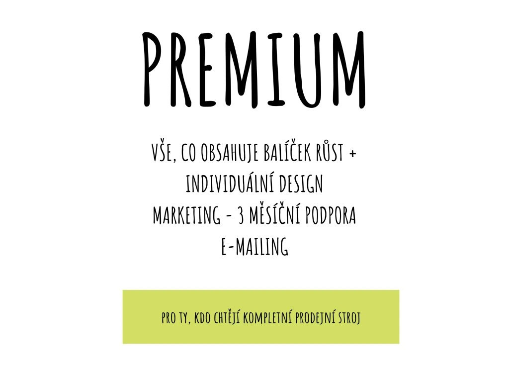 Balíček PREMIUM je komplexní řešení pro výrobce, kteří chtějí e-shop jako plnohodnotný prodejní kanál – ne jen doplněk. Navrhneme individuální design, nastavíme marketing, e-mailing i práci se zákaznickou databází.