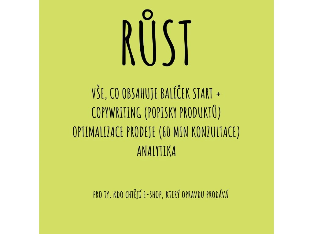 Balíček RŮST posouvá váš e-shop z technického řešení na skutečný prodejní nástroj. Zapojíme prodejní texty, optimalizaci nákupní cesty i analytiku, díky které uvidíte, co funguje a co zvyšuje tržby.